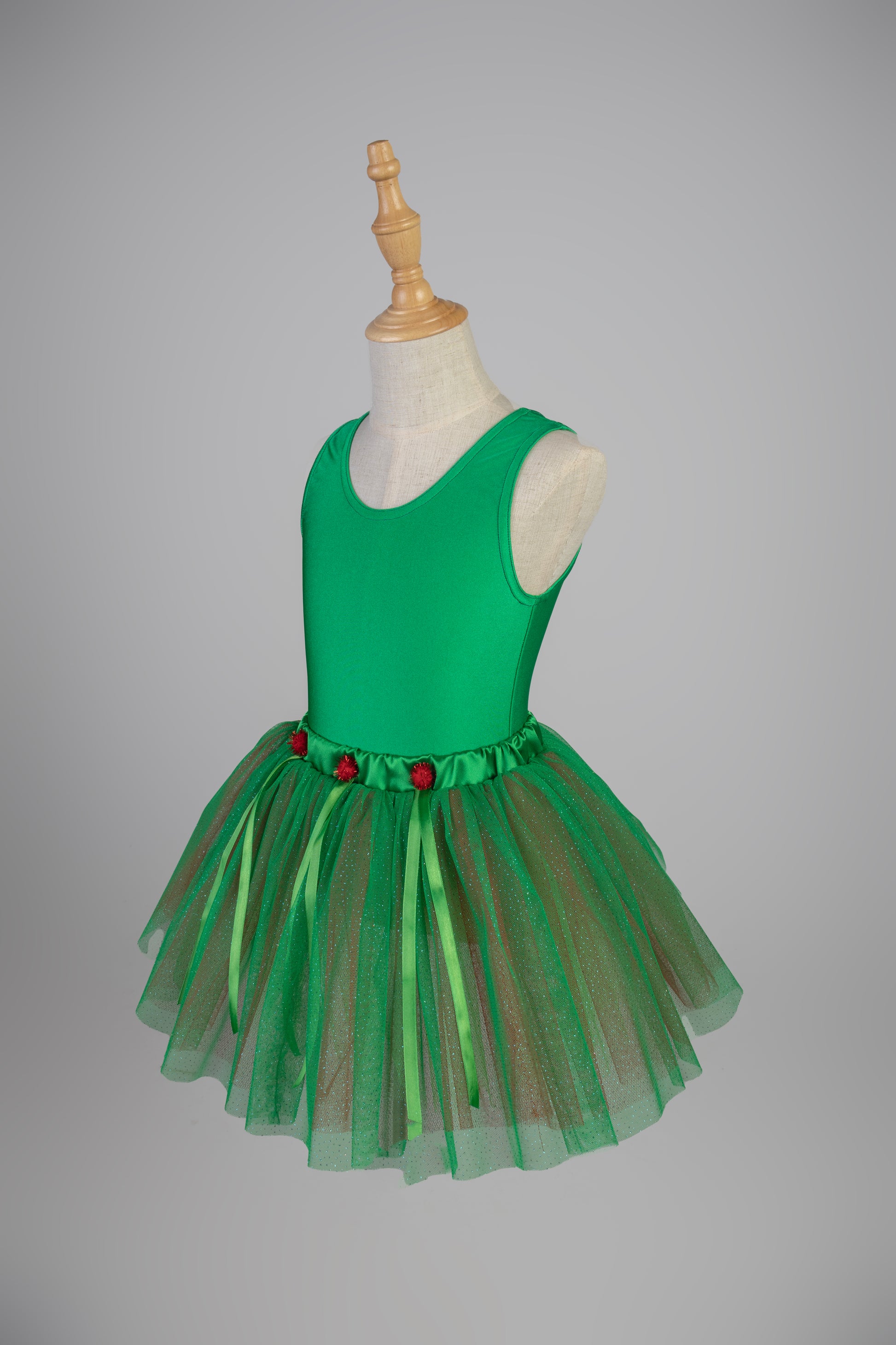 The "Ivy" is Dressed for Dance's Green Christmas Tutu. This festive garment is made with three fully gathered tulle layers, including a glittery top layer. For additional sparkle and cheer, the Ivy tutu is embellished with ribbon and pom poms. Available for purchase as a single tutu or as a set with a matching leotard for ages from 2-3 years all the way to 8-9 years.